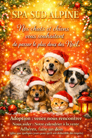 Toute l'équipe de la Spa sud alpine (Animaux, bénévoles, salariés) vous souhaite un joyeux Noël. Et un message à tous ceux qui désirent un chien ou un chat à la maison, ADOPTEZ !