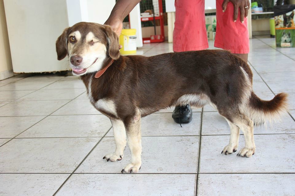 il avait un œil crevé, il a fallu l'opérer en urgence et il a été castré. Il a été testé diro négatif. Il fait une dizaine de kg. Sa famille d'accueil en guadeloupe était très attachée à lui, c'est vraiment un petit chien calme et affectueux qui ne laisse personne indifférent. Il est ok tout, il même un peur des chats qu'il ne connait pas, pensez, il ne lui reste plus qu'un oeil alors il se méfie! Vite venez le chercher au refuge de Veynes car lui, n'a pas eu la chance à son arrivée de trouver une famille d'accueil. Il est bien triste. C'est un pauvre calimero. Plus de renseignement, n'hésitez pas à appaler Stéphane au 06 58 09 59 43 merci pour lui!